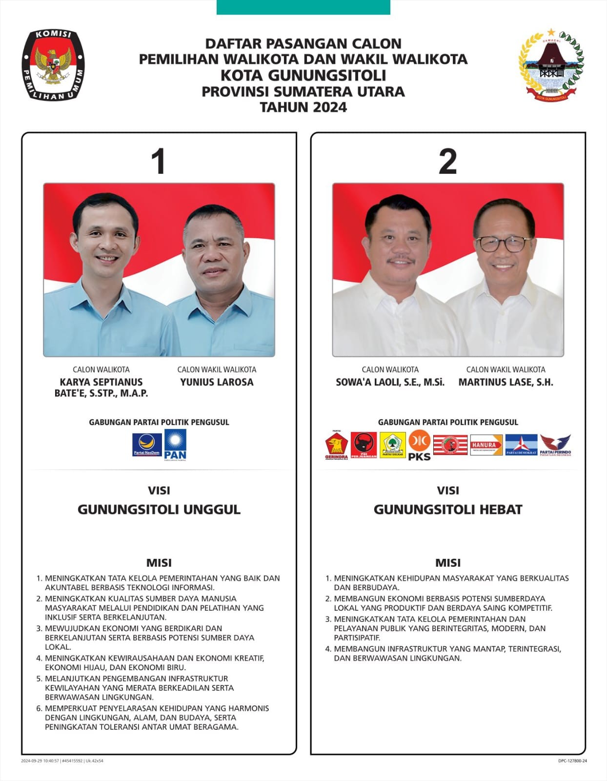 DAFTAR PASANGAN CALON PEMILIHAN WALI KOTA DAN WAKIL WALI KOTA GUNUNGSITOLI TAHUN 2024