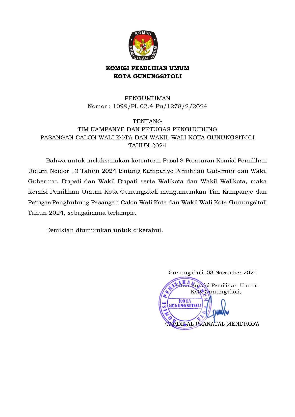 Bahwa untuk melaksanakan ketentuan Pasal 8 Peraturan Komisi Pemilihan Umum Nomor 13 Tahun 2024 tentang Kampanye Pemilihan Gubernur dan Wakil Gubernur, Bupati dan Wakil Bupati serta Walikota dan Wakil Walikota, maka Komisi Pemilihan Umum Kota Gunungsitoli mengumumkan Tim Kampanye dan Petugas Penghubung Pasangan Calon Wali Kota dan Wakil Wali Kota Gunungsitoli Tahun 2024, sebagaimana terlampir KLIK DISINI....
