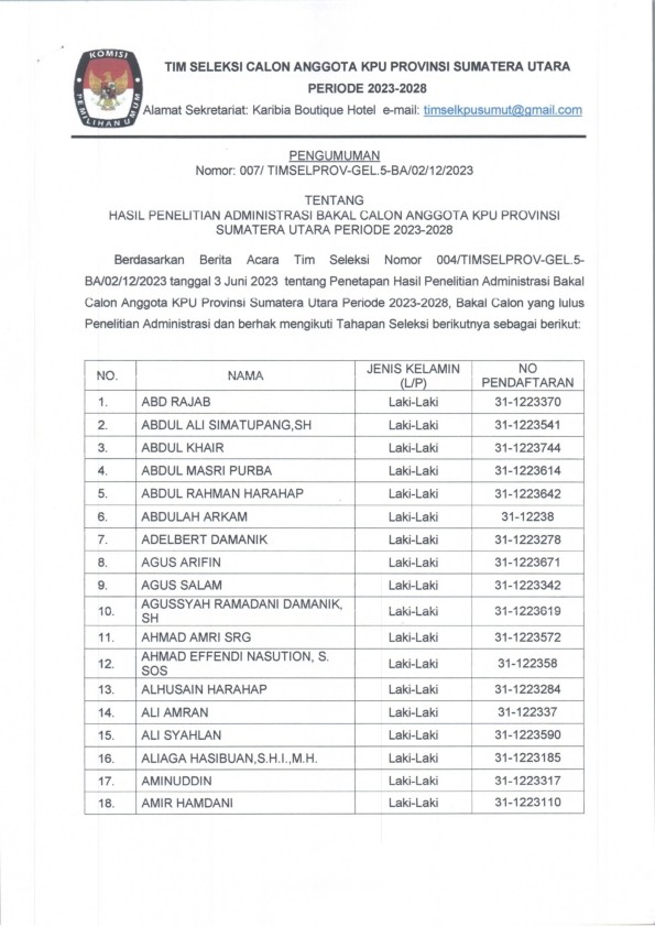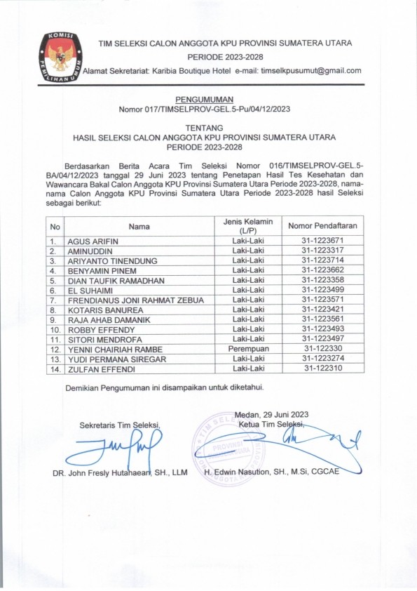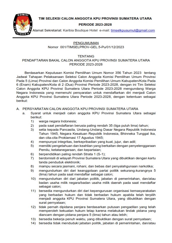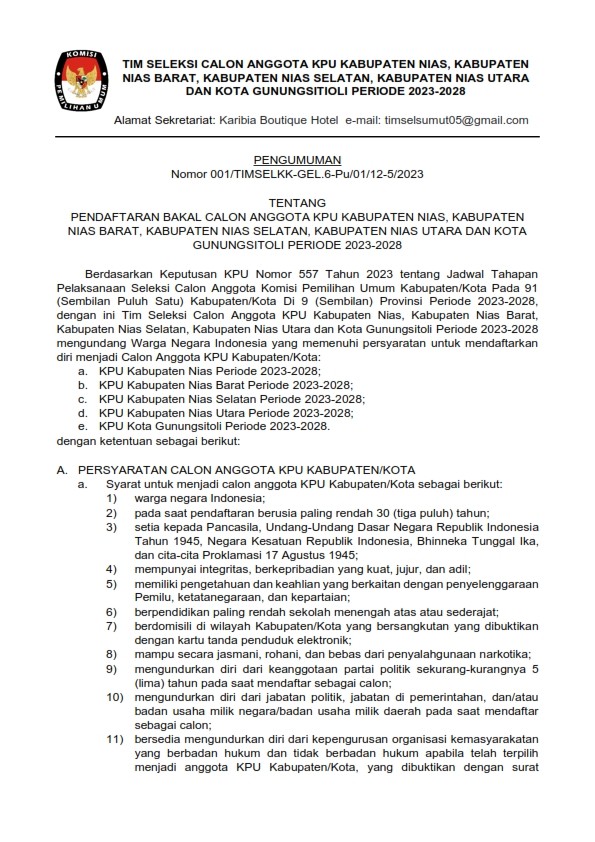 Gunungsitoli, 13 Juni 2023 || Berdasarkan Keputusan KPU Nomor 557 Tahun 2023 tentang Jadwal Tahapan Pelaksanaan Seleksi Calon Anggota Komisi Pemilihan Umum Kabupaten/Kota Pada 91 (Sembilan Puluh Satu) Kabupaten/Kota Di 9 (Sembilan) Provinsi Periode 2023-2028, dengan ini Tim Seleksi Calon Anggota KPU Kabupaten Nias, Kabupaten Nias Barat, Kabupaten Nias Selatan, Kabupaten Nias Utara dan Kota Gunungsitoli Periode 2023-2028 mengundang Warga Negara Indonesia yang memenuhi persyaratan untuk mendaftarkan diri menjadi Calon Anggota KPU Kabupaten/Kota: